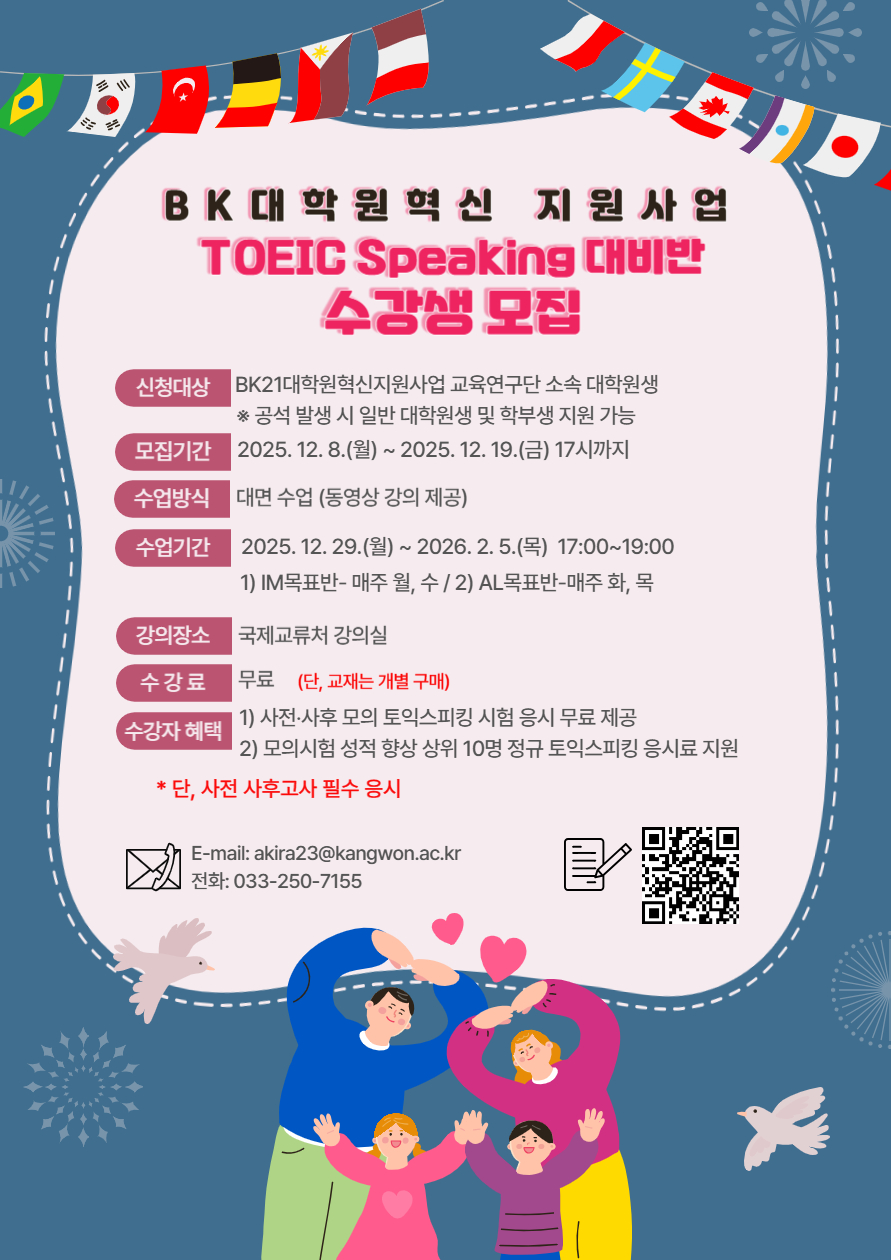 2. 2025년 BK21 대학원혁신지원사업의 일환으로 우리대학교 대학원생들의 국제화 역량 제고를 위한 토익 스피킹 강좌 수강생을 모집합니다.